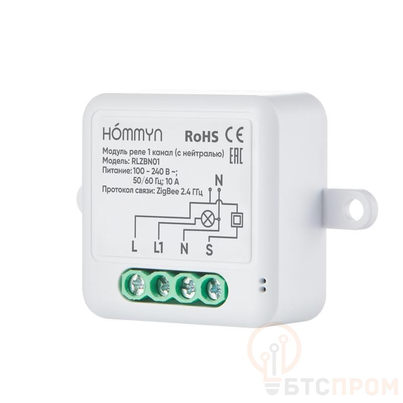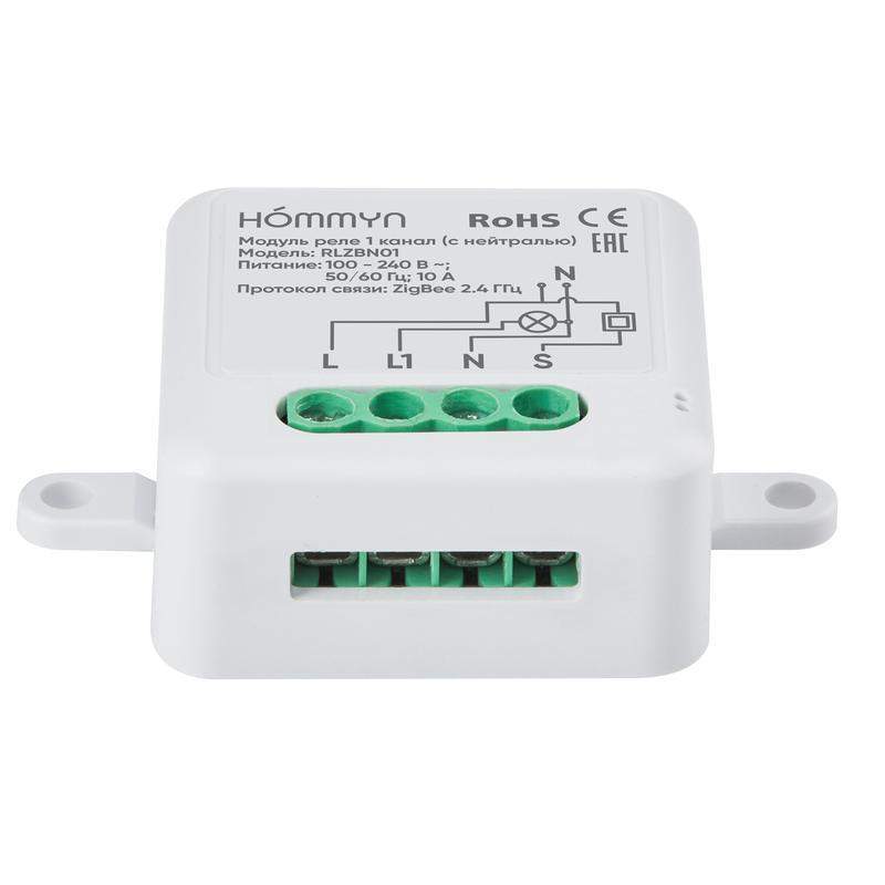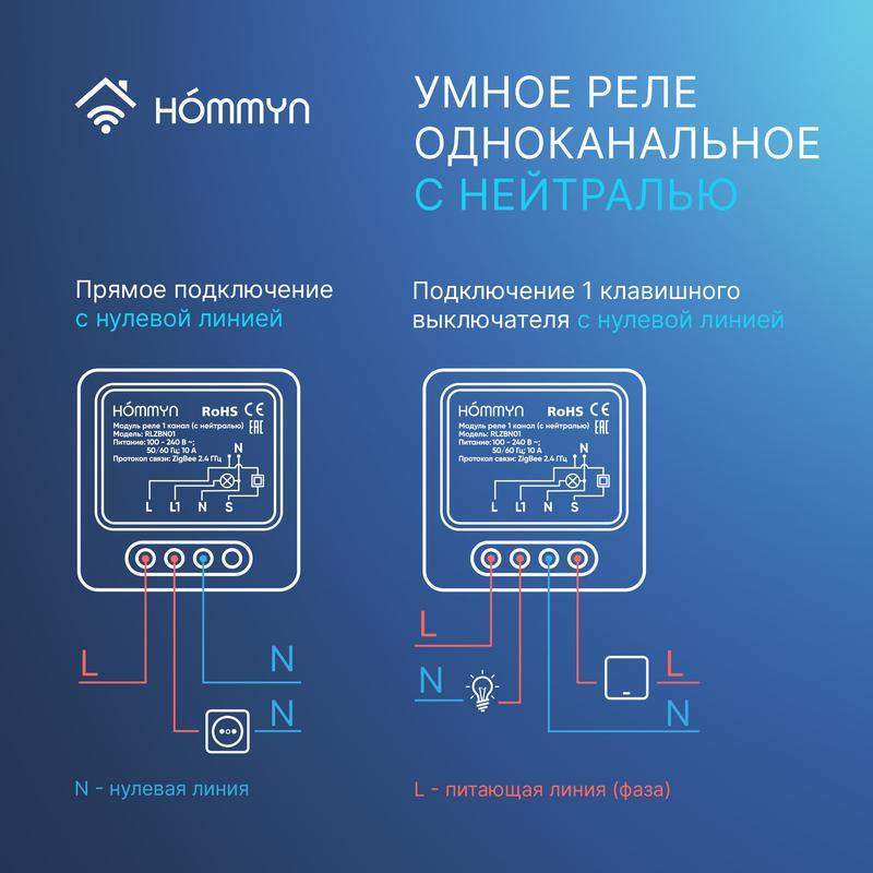 Модуль реле HOMMYN Zigbee 1 канал (с нейтралью) Одноканальное умное реле позволяет «прокачать» ваши любимые домашние «неумные» одноклавишный выключатель или розетку, делая их умными, не меняя их оригинальные функции и внешний вид. Компактный размер реле позволяет провести его монтаж в стандартный круглый подрозетник, спрятав его в стене за выключателем или розеткой. Для подключения требуется питающая линия L (фаза) и нулевая линия N (нейтраль). Умное реле позволяет не только управлять включением и выключением освещения или прибором с кнопки выключателя или прибора, но также добавляет возможность удаленного управления через приложение или с помощью голосовых помощников Алиса и Маруся. Реле работает с приложением Hommyn, для подключения требуется Zigbee хаб Hommyn. Реле подключается напрямую к станциям Алиса от Яндекс с Zigbee и работает в приложении Умный Дом с Алисой. Основные функции: · включает и выключает освещение или подключенный прибор по кнопкам, через приложение или с помощью голосовых помощников Алиса и Маруся; · поддерживает настройку по расписанию через приложение; · компактные размеры позволяют смонтировать реле в стандартную круглую монтажную коробку в стене и спрятать его за обычный «неумный» выключатель или розетку; · для подключения к электроцепи требуется нулевая линия N (нейтраль) и питающая линия L (фаза); · реле на 1 канал управляет 1 группой нагрузки (например, 1 лампочка), реле на 2 канала управляет 2 группами нагрузки (например, 2 лампочки); · имеет защиту от скачков напряжения; · максимальная нагрузка: до 2200 Вт (резистивная нагрузка); · является ретранслятором Zigbee 3.0; · работает с приложением Hommyn; · работает с приложением Умный Дом с Алисой; · поддерживает сценарии автоматизации с другими датчиками и приборами в приложении Умный Дом с Алисой; · для подключения в приложение требуется либо Zigbee хаб Hommyn, либо станции Алиса от Яндекс с Zigbee. Установка и настройка Монтаж и подключение производится в соответствии с руководством пользователя, прилагаемым к продукту. Требуется нулевая линия N.