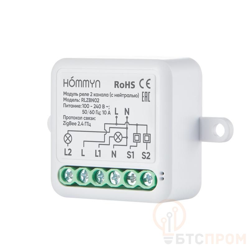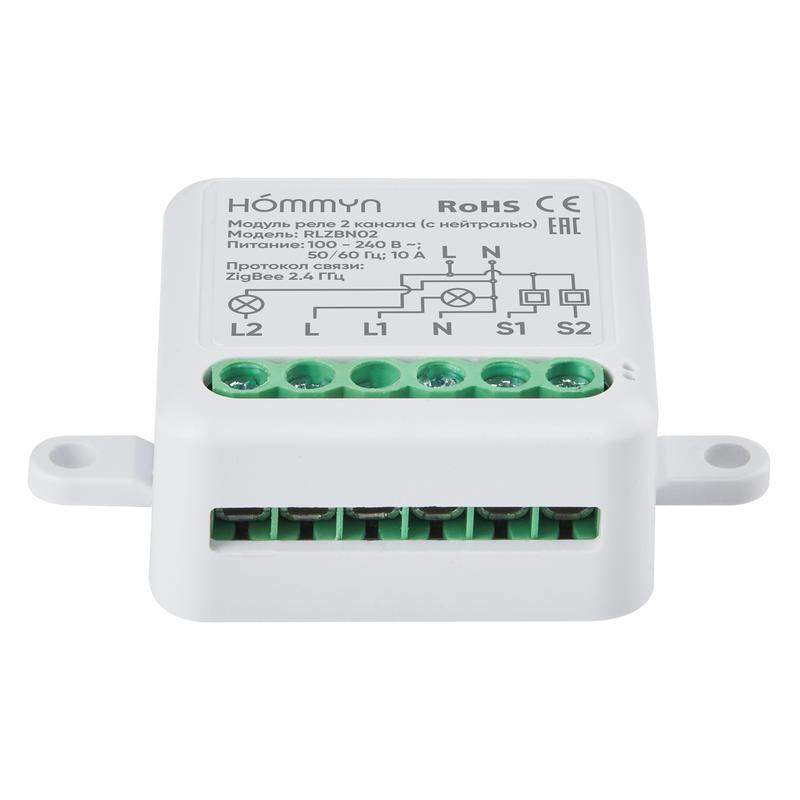 Модуль реле HOMMYN Zigbee 2 канала (с нейтралью) Двухканальное умное реле позволяет «прокачать» ваши любимые домашние «неумные» двухклавишный выключатель или розетку, делая их умными, не меняя их оригинальные функции и внешний вид. Компактный размер реле позволяет провести его монтаж в стандартный круглый подрозетник, спрятав его в стене за выключателем или розеткой. Для подключения требуется питающая линия L (фаза) и нулевая линия N (нейтраль). Умное реле позволяет не только управлять включением и выключением освещения или прибором с кнопки выключателя или прибора, но также добавляет возможность удаленного управления через приложение или с помощью голосовых помощников Алиса и Маруся. Реле работает с приложением Hommyn, для подключения требуется Zigbee хаб Hommyn. Реле подключается напрямую к станциям Алиса от Яндекс с Zigbee и работает в приложении Умный Дом с Алисой. Основные функции: · включает и выключает освещение или подключенный прибор по кнопкам, через приложение или с помощью голосовых помощников Алиса и Маруся; · поддерживает настройку по расписанию через приложение; · компактные размеры позволяют смонтировать реле в стандартную круглую монтажную коробку в стене и спрятать его за обычный «неумный» выключатель или розетку; · для подключения к электроцепи требуется нулевая линия N (нейтраль) и питающая линия L (фаза); · реле на 1 канал управляет 1 группой нагрузки (например, 1 лампочка), реле на 2 канала управляет 2 группами нагрузки (например, 2 лампочки); · имеет защиту от скачков напряжения; · максимальная нагрузка: до 2200 Вт (резистивная нагрузка); · является ретранслятором Zigbee 3.0; · работает с приложением Hommyn; · работает с приложением Умный Дом с Алисой; · поддерживает сценарии автоматизации с другими датчиками и приборами в приложении Умный Дом с Алисой; · для подключения в приложение требуется либо Zigbee хаб Hommyn, либо станции Алиса от Яндекс с Zigbee. Установка и настройка Монтаж и подключение производится в соответствии с руководством пользователя, прилагаемым к продукту. Требуется нулевая линия N.