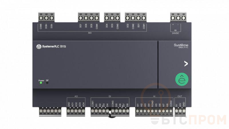 Модуль ввода/вывода серии SystemePLC типа S172 совместимый с интеллектуальным реле SR2 и ПЛК S172. Напряжение питания: 24 VDC. Потребляемая мощность: не более 10 Ватт (0,5 А). Общее количество входов/выходов - 28. 28 IO: 16 дискретных входов, 12 дискретных выходов (реле, 3 A). Без дисплея. Совместимость с пластроном: есть, глубина пластрона от 46 мм. Степень защиты: IP20. Габаритные размеры: 150x80x58. Температура эксплуатации: -20 - 55 °С.