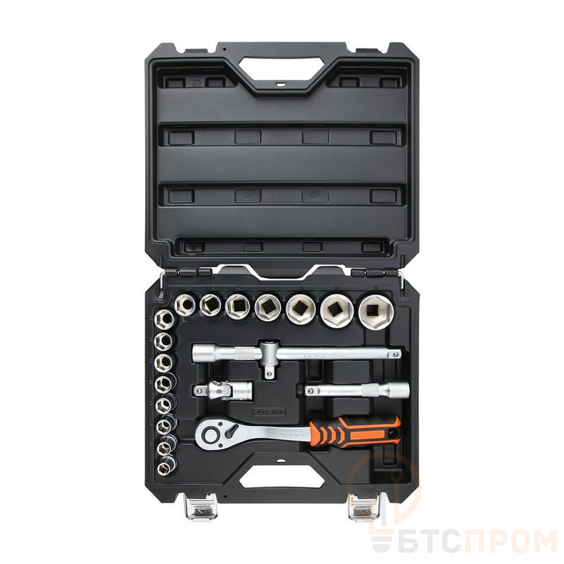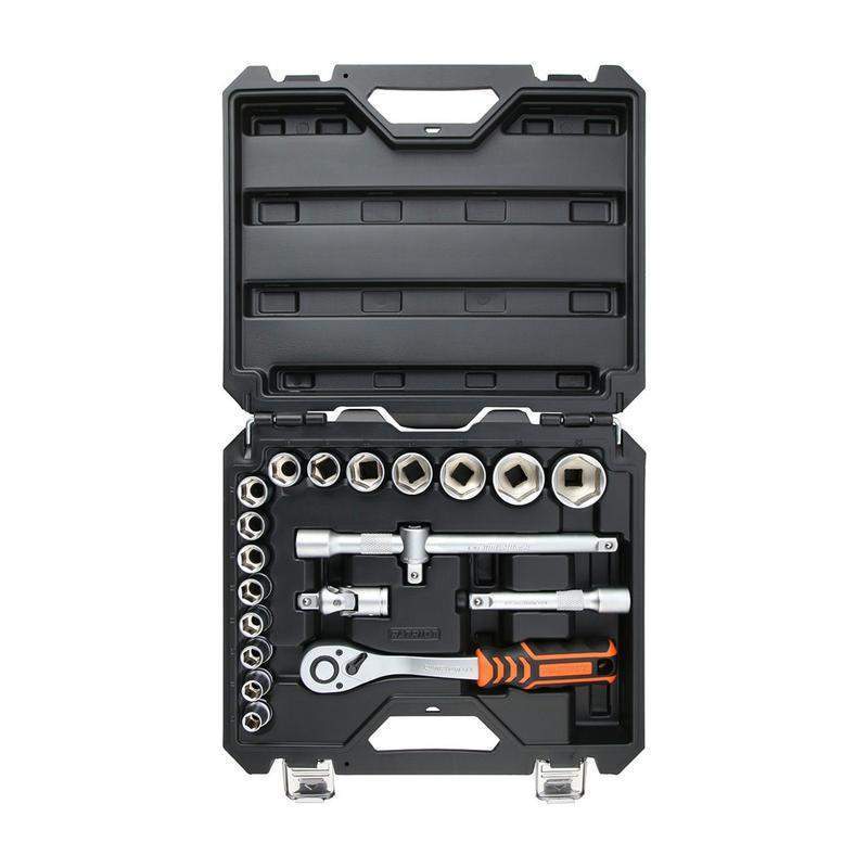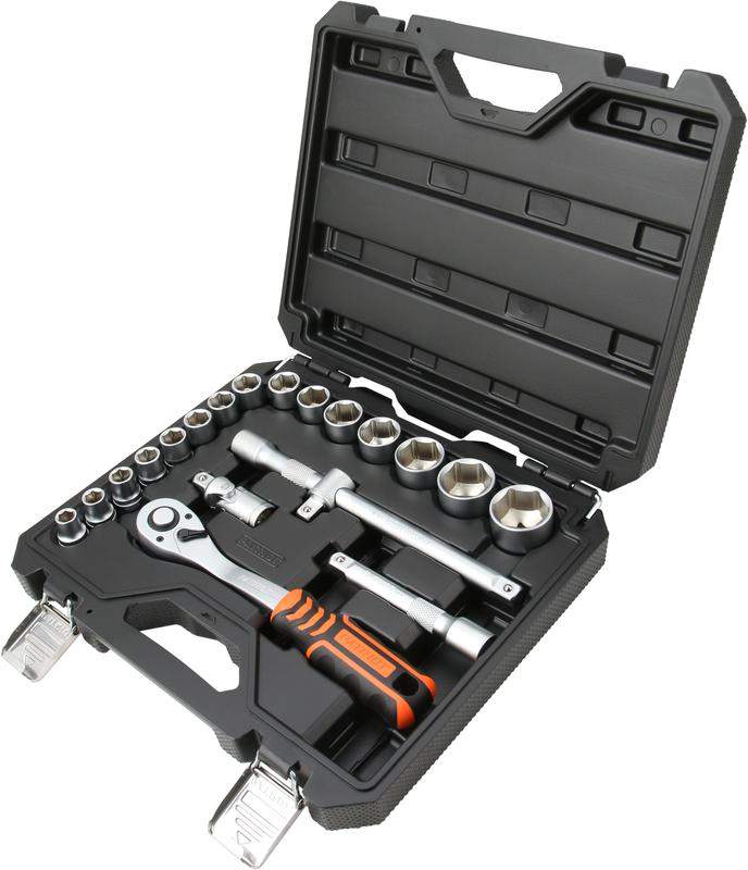 "Компактный автомобильный набор инструментов SSP 20 для монтажа и демонтажа крепежа. Можно использовать набор инструментов для автомобиля в гараже, либо для бытовых задач дома. Набор инструментов автомобильный включает в себя 20 предметов из высококачественной хромованадиевой стали (Cr-V). Хромированное покрытие препятствует образованию коррозии и ржавчины. Реверсивная трещотка (72 зуба, шаг 5 градусов) с кнопкой быстрого съема головки. Двухкомпонентная рукоятка имеет насечки, подпальцевые выемки и резиновые вставки для снижения нагрузки на запястье. Набор головок предназначен для работы с резьбовыми соединениями. Шарнир карданный, удлинители, адаптер-переходник для работы в труднодоступных местах и стесненных условиях. Все инструменты и оснастка аккуратно расположены в ложементах внутри ударопрочного фирменного пластикового кейса, который крепко закрывается на два металлических зажимных замка-защелки. Легко поместится в багажник."