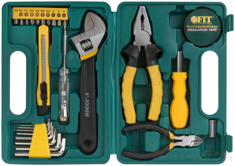 Набор инструментов FIT IT (26 предметов) предназначен для проведения ремонтных работ. В наборе: пассатижи (165 мм), ключ разводной (200 мм), отвертка индикаторная, бокорезы '’мини'’ (115 мм), переходник с воротка 1/4' на биту, переходник с биты на головку 1/4', отвертка с магнитным фиксатором бит, 8 ключей HEX (1.5, 2.0, 2.5, 3.0, 4.0, 5.0, 5.5, 6.0 мм), 9 бит — 25 мм (SL4, SL5, SL6, PH1, PH2, PZ1, PZ2, T15, T20), лента изоляционная, нож технический (9 мм). Инструменты выполнены из качественной инструментальной стали, отличаются прочностью и износостойкостью. Набор поставляется в удобном пластиковом чемодане.