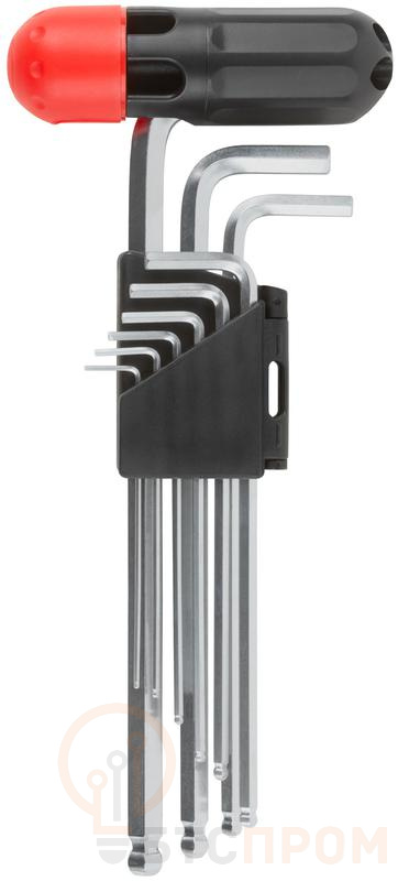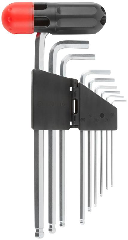 Набор шестигранных ключей FIT IT в складном пластиковом держателе предназначен для закручивания и откручивания крепежа с внутренним шестигранником при проведении ремонтных работ. Шаровые наконечники ключей позволяют работать в труднодоступных местах под углом до 35°. T-образная ручка в комплекте повышает удобство работы. Увеличенная длина ключей позволяет передавать большее усилие во время работы. Ключи изготовлены из хром-ванадиевой стали, отличаются прочностью и износостойкостью. Хромированное покрытие ключей предотвращает коррозию. 9 ключей в комплекте обеспечивают широкий спектр применения.