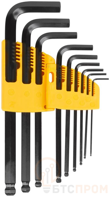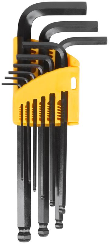 Набор шестигранных ключей FIT IT в складном пластиковом держателе предназначен для закручивания и откручивания крепежа с внутренним шестигранником при проведении ремонтных работ. Шаровые наконечники ключей позволяют работать в труднодоступных местах под углом до 35°. Ключи изготовлены из хром-ванадиевой стали, отличаются прочностью и износостойкостью. Обеспечивают высокий крутящий момент. 9 ключей в комплекте обеспечивают широкий спектр применения.