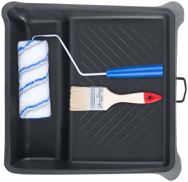 Набор малярный "Универсальный №2" MOS 03051М — это готовое решение для быстрого и качественного проведения покрасочных работ. Комплект включает все необходимое: прочную пластиковую ванночку размером 270х270 мм для удобного распределения краски, полиакриловый валик с ворсом 9 мм и шириной 150 мм для нанесения покрытия на большие ровные поверхности, а также кисть шириной 50 мм для обработки углов, краев и труднодоступных мест.