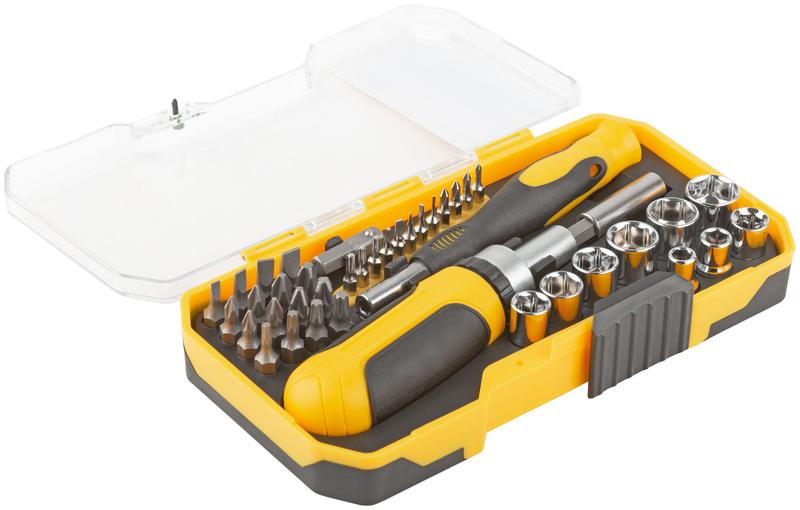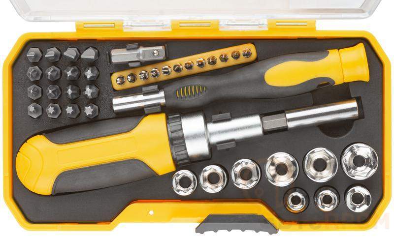 16 бит с магнитным наконечником: SL3, SL4, SL5, SL6; PH0, PH1, PH2, PH3; PZ0, PZ1, PZ2, PZ3; T10, T15, T20, T25; 12 бит для точных работ с магнитным наконечником: PH000, PH00, PH0, PH1; SL1, SL1.5, SL2, SL2.5; T6, T7, T8, T9; 9 головок: 5, 6, 7, 8, 9, 10, 11, 12, 13 мм; переходник с биты на головку; магнитный адаптер для быстрой смены бит (L = 60 мм); отвертка реверсивная с магнитным наконечником; отвертка для точных работ с магнитным наконечником. Материал: биты, переходник и хвостовик адаптера из хром-ванадиевой стали, головки и корпус адаптера из инструментальной стали с хромированным покрытием, отвертки из инструментальной стали и прорезиненного пластика. Упаковка: пластиковый прорезиненный кейс.