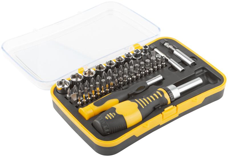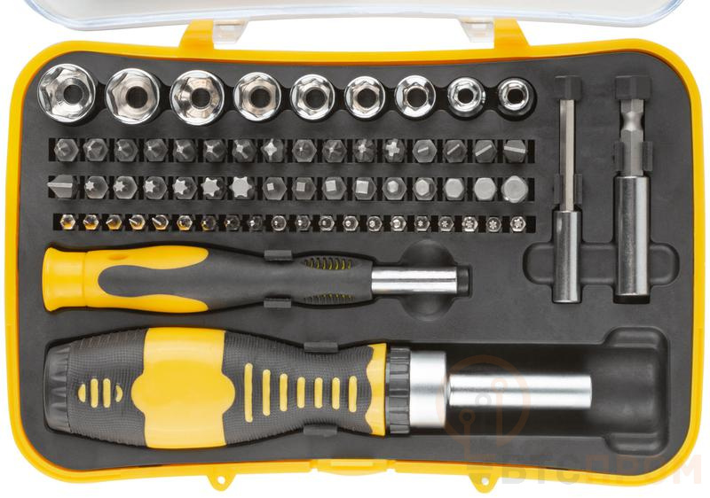 Набор насадок с реверсивной отверткой FIT IT в пластиковом кейсе предназначен для работ с крепежными элементами. Набор включает в себя 65 предметов: 31 бита с магнитным наконечником; 20 бит для точных работ с магнитным наконечником; 9 головок; переходник с биты на головку; 2 магнитных адаптера для быстрой смены бит; отвертка реверсивная с магнитным наконечником; отвертка для точных работ с магнитным наконечником. Биты изготовлены из закаленной хром-ванадиевой стали и обладают высокой износостойкостью. Пескоструйная обработка бит и хромированное покрытие предотвращают коррозию. Функция реверса в отвертке повышает скорость работы. Полая конструкция рукоятки дает возможность хранить мелкие предметы. Вращающийся наконечник на отвертке для точных работ упрощает использование. Резиновые вставки на рукоятках предотвращают проскальзывание инструмента.