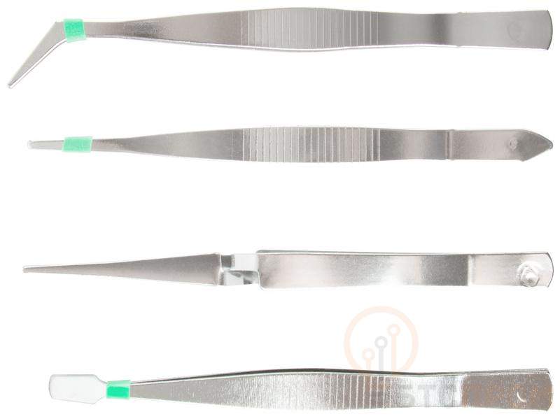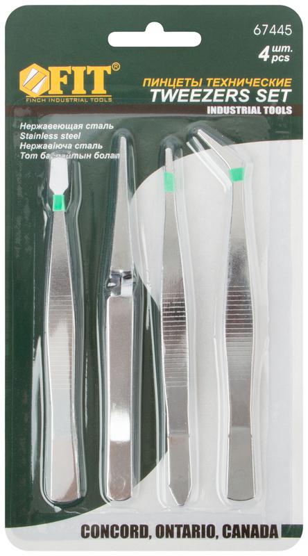 Набор пинцетов технических FIT IT предназначен для ремонта электроники. Набор включает в себя прямой пинцет, пинцет с захватом под углом 45°, пинцет с изогнутым широким захватом, пинцет обратного действия. Пинцеты изготовлены из качественной инструментальной стали, что обеспечивает их долговечность. Хромированное покрытие защищает от коррозии.