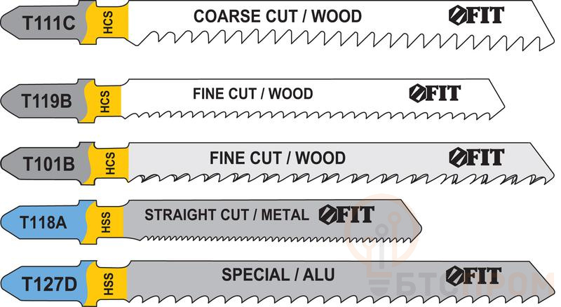 Универсальный набор полотен FIT IT (T111C, T119B, T101B, T118A, T127D) предназначен для выполнения широкого спектра работ по дереву и металлу. В наборе представлены полотна с различными типами зубьев и шагом, что позволяет подобрать оптимальный вариант для конкретной задачи, будь то грубый распил древесины или тонкий рез металла. Все полотна изготовлены из высококачественной стали и имеют закалку высокой твердости, что обеспечивает высокую износостойкость и долгий срок службы. Универсальный Т-образный хвостовик европейского типа гарантирует совместимость полотен с большинством моделей электролобзиков, представленных на рынке.