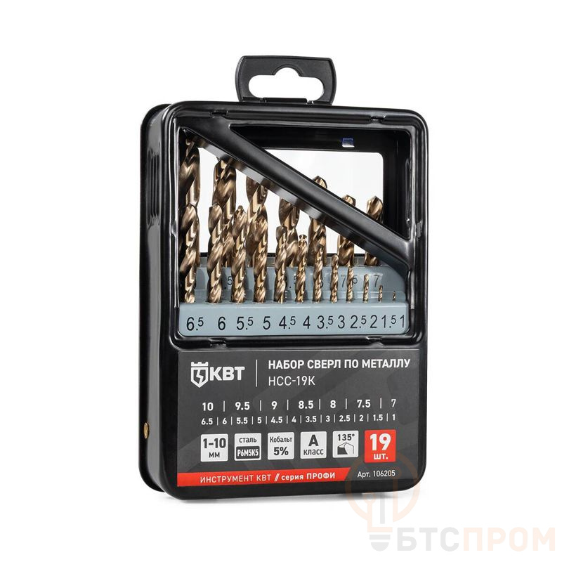 Набор сверл НСС-19К ПРОФИ от КВТ — профессиональный инструмент для точного и быстрого сверления отверстий в металле. Комплект включает 19 сверл из быстрорежущей стали Р6М5 с титановым покрытием, диаметром от 1,0 до 10,0 мм с шагом 0,5 мм.