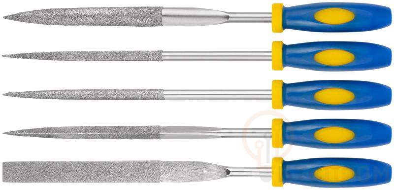 Надфили алмазные FIT HQ арт. 42175 (набор, 5 шт.) предназначены для опиливания мелких деталей из различных твердых материалов. В набор включены надфили с плоской, круглой, полукруглой, трехгранной и квадратной рабочей частью. Рабочие части надфилей выполнены из легированной инструментальной стали с алмазным напылением, рукоятка - из прорезиненного пластика.