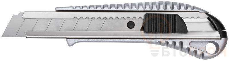 Применяется для резки бумаги, обоев,скотча, картона средней твердости.Рифленая форма ножа обеспечивает крепкий захват и предотвращает выскальзывание при использовании. Компактный корпус изготовлен из алюминиевого сплава, сегментированное лезвие из высокоуглеродистой инструментальной стали состоит из 15 сегментов,гарантирует устойчивость во время работы.Нож имеет металлические направляющие и фиксатор лезвия.