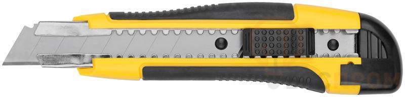 Применяется для резки бумаги, обоев,скотча, картона средней твердости.Сегментированное лезвие 15 сегментов из инструментальной стали. Пластиковый корпус с прорезиненными вставками обеспечивает крепкий захват и предотвращает выскальзывание при экплуатации.Металлические направляющие с двусторонней автофиксацией, обеспечивают защиту лезвия от поломки и допускают увеличенные нагрузки