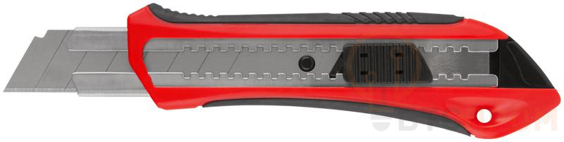 «Рубин». Сегментированное лезвие из высокоуглеродистой инструментальной стали. Металлическая направляющая с двусторонней автофиксацией для усиления конструкции. Прорезиненный корпус из ударопрочного ABS пластика. Упаковка: блистер.