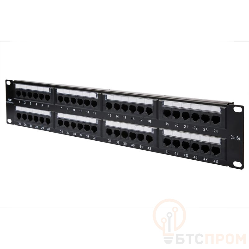 Коммутационная панель Datarex DR-405100 — это 19-дюймовая панель категории 5e высотой 2U, оснащенная 48 портами RJ45. Кроссировка выполняется по стандартам T568A и T568B, что обеспечивает универсальность при монтаже. Панель имеет черный цвет и комплектуется кабельными организаторами для аккуратного размещения патч-кордов.