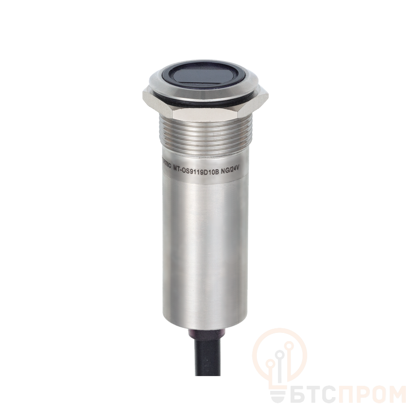 Переключатель оптический MT-OS9119D10BNG от компании ОВЕН — это надежный датчик положения, выполненный в корпусе диаметром 19 мм с классом защиты IP65, что обеспечивает защиту от пыли и струй воды. Устройство работает по принципу NPN-транзистора (открытый коллектор) с нормально разомкнутым (NO) контактом и питается от постоянного напряжения 24 В DC.