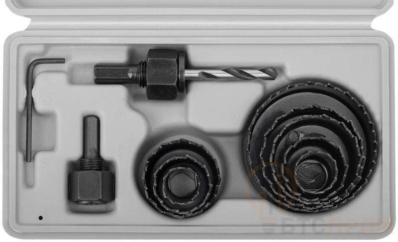 Усиленный адаптер. Профи. Для высверливания отверстий в древесине твердых и мягких пород, ДСП и фанере. В наборе 8 пил круговых: 19, 22, 29, 32, 38, 44, 51 и 64 мм. Материал: термообработанная усиленная инструментальная сталь. Упаковка: пластиковый кейс.