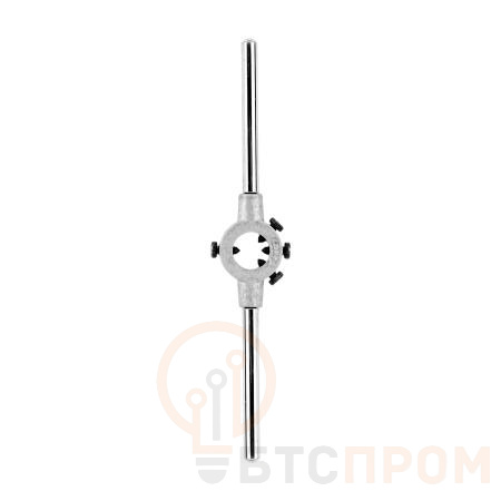 Корпус выполнен из прочной инструментальной стали, что обеспечивает долговечность и устойчивость к нагрузкам. Вращающиеся рукоятки снижают утомляемость оператора и позволяют вести работу с высокой точностью. В комплекте предусмотрен стопорный винт для жесткой фиксации плашки, предотвращающей проворачивание.