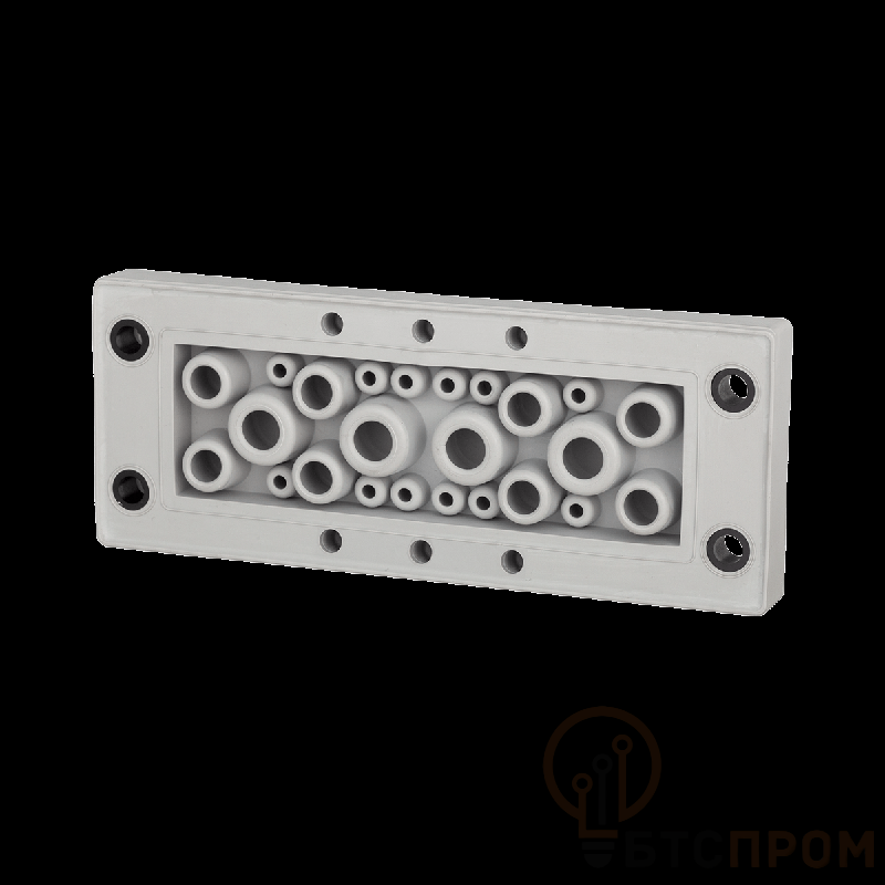 Устройство оснащено набором отверстий разного диаметра: 4 отверстия 9-16.2 мм, 8 отверстий 7.2-12 мм и 12 отверстий 3.2-6.5 мм, что позволяет герметизировать и разделять кабели различного сечения. Пластина обеспечивает защиту от пыли и механических повреждений, повышает безопасность и эстетику монтажа.
