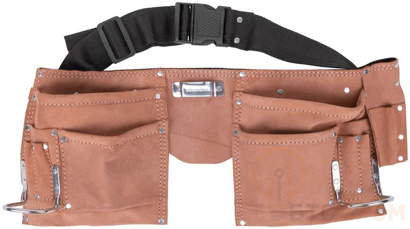Кожаный пояс для инструмента FIT IT предназначен для переноски инструментов и крепежа во время проведения кровельных, монтажных, слесарных и других видов работ. Пояс изготовлен из натуральной кожи, обладающей высокой прочностью и износостойкостью. Стальные петли для инструмента прочно зафиксированы на заклепках и обеспечивают безопасную переноску тяжелого инструмента. Возможность переноски большого количества инструментов достигается за счет наличия 11 отделений различных размеров. Эластичность карманов позволяет быстро доставать мелкие предметы и крепеж. Поясной ремень имеет возможность регулировки.