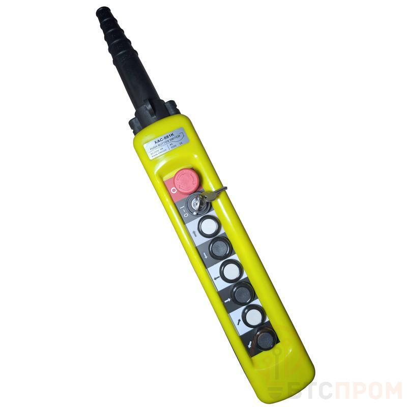 Основные характеристики: 6 кнопок управления с фиксацией, одна кнопка независимого аварийного останова («СКОР. АВАР. СТОП») и ключ-выключатель для блокировки пульта. Такая конфигурация обеспечивает точный и безопасный контроль над мостами кранов, тельферами и другими механизмами. Наличие ключа предотвращает несанкционированный доступ.