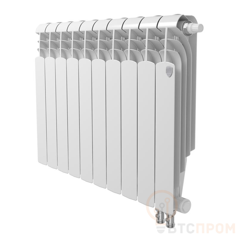 Биметаллический радиатор для любых систем отопления с нижним подключением Уникальная разработка. Первый радиатор спроектированный в лаборатории Royal Thermo с применением математического моделирования, что позволило увеличить теплоотдачу прибора на 3%. Повышенная мощность, технология POWERSHIFT. Дополнительное оребрение на вертикальном коллекторе секции увеличивает теплоотдачу радиатора на 5%. Такое решение способствует более быстрому обогреву помещений при том же размере и весе секций. 100% НАСТОЯЩИЙ БИМЕТАЛЛ. Применение полностью стального закладного элемента, выполненного из углеродистой стали марки 20, которая отличается повышенной коррозионной стойкостью и эксплуатационной надежностью. Гарантирует надежную работу в системах, подверженных гидроударам и с химически агрессивными теплоносителями (в том числе антифризами). Oxsilan 9807 новое поколение экологически чистого покрытия без тяжелых металлов и фосфатов Oxsilan 9807 наносится на секцию радиатора перед покраской и за счет улучшенной адгезии лакокрасочного покрытия повышает антикоррозийную стойкость и долговечность радиаторов. Сверхстойкая 7-этапная NANO-покраска TECNOFIRMA. Нанесение экологически чистых нано-красок AkzoNobel (Нидерланды) и FreiLacke (Германия) в семь этапов гарантирует стойкость к механическим повреждениям и обеспечивает долговечность покрытия радиатора в помещениях с повышенной влажностью. В комплекте: вентильная вставка, направляющая потока, кран Маевского в цвет радиатора, гайки с заглушкой в цвет радиатора и адаптеры для узлов нижнего подключения.