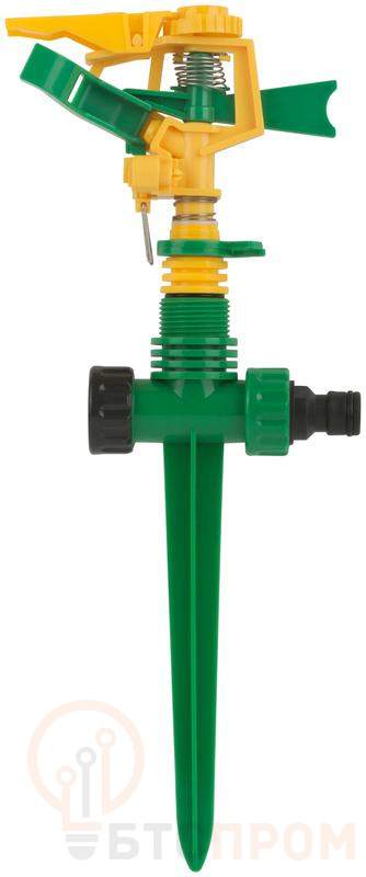 Импульсный, пластиковый. На пике. Присоединяется к шлангу при помощи универсального соединителя. Совместим со всеми элементами аналогичной поливочной системы. Два соединительных гнезда обеспечивают его использование в цепи из нескольких распылителей. Регулировка поворота головки от 0° до 360° позволяет орошать заданный участок. Радиус разбрызгивания – 178метров. Материал: пластик. Упаковка:8картонный подвес.