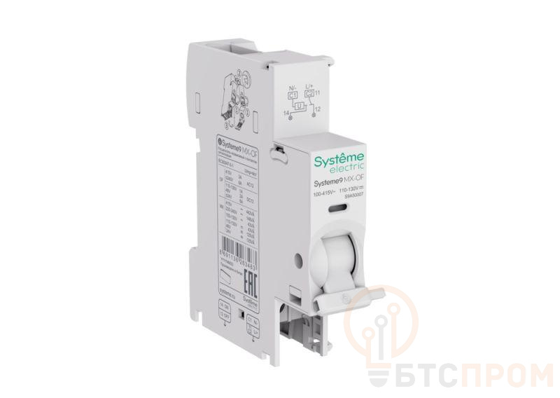 Независимый расцепитель с контактом сигнализации положения «включено - отключено» (MX+OF) S9. При подаче питания на контакты расцепителя, вызывает отключение соответствующего аппарата. Снабжён контактом OF для сигнализации положения «включено» или «отключено». Диапазон напряжений управления: 100 - 415 В AC/DC. Присоединяется к автоматическим выключателям, автоматическим дифференциальным выключателям, выключателям дифференциального тока и блокам дифференциального тока (монтаж на АВ) серии Systeme9, для реализации функции дистанционного отключения и сигнализации. Ширина устройства - 18мм. Устанавливается защёлкиванием (без использования инструмента) слева от соответствующего аппарата. Расцепители монтируются на устройство первыми, дополнительные контакты монтируются после них. Максимальное количество расцепителей для одного устройства - 2 штуки.