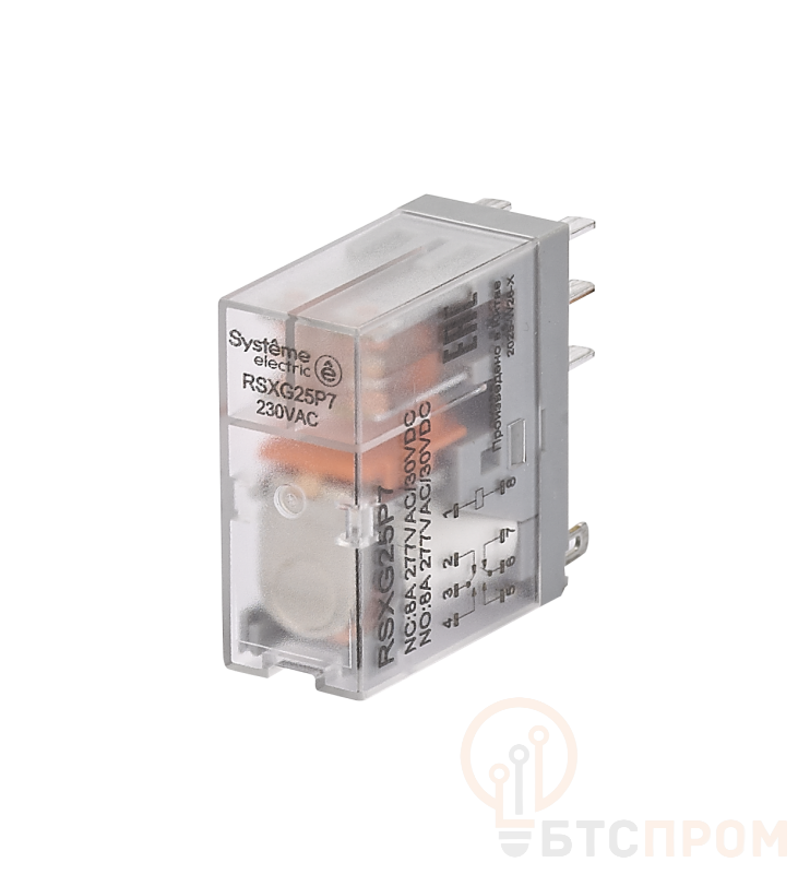 Реле SE RSXG25P7 — это надежное и универсальное электромеханическое устройство, предназначенное для коммутации цепей переменного тока. Ключевой характеристикой является наличие двух независимых переключающих контактов (2CO) с максимальной коммутируемой нагрузкой 8А при напряжении 230В переменного тока. Такая конструкция позволяет одновременно управлять двумя различными цепями или обеспечивать резервирование системы.