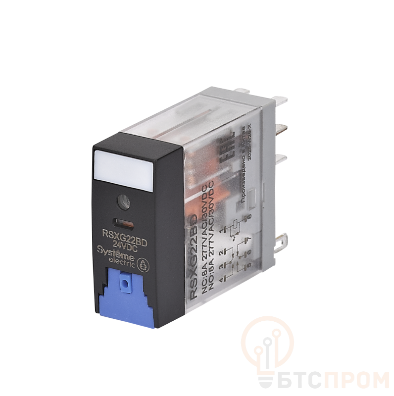 Реле SE RSXG22BD — это компактное и надечное электромеханическое реле, предназначенное для коммутации цепей управления и сигнализации. Ключевая характеристика — два перекидных контакта (2CO) с номинальной коммутационной способностью до 8А при напряжении 24В постоянного тока. Устройство оснащено светодиодным индикатором срабатывания и удобной тестовой кнопкой для ручной проверки функциональности и удобства монтажа.