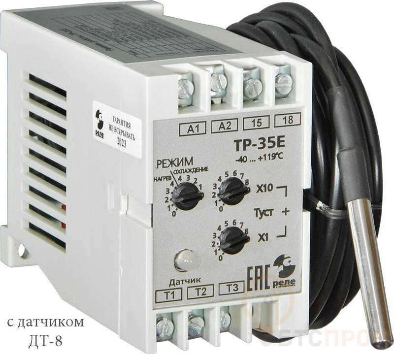 Реле температурное ТР-35Е в компл. с датчиком ДТ-8 кабель 3м -40...+119град.C 220В 50Гц режим НАГРЕВ ОХЛАЖДЕНИЕ гистерезис 4град.C макс. коммутируемый ток 10А 1з УХЛ4 Реле и Автоматика A8223-82693539