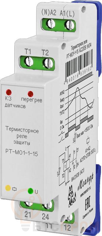 Реле термисторной защиты двигателя РТ-М01-1-15 AC400В УХЛ4 от производителя «Меандр» (артикул A8302-16939190) предназначено для эффективного контроля перегрева трехфазных асинхронных электродвигателей. Устройство обеспечивает надежную защиту по температуре, отслеживая сопротивление встроенных в обмотку двигателя позисторов (термисторов).