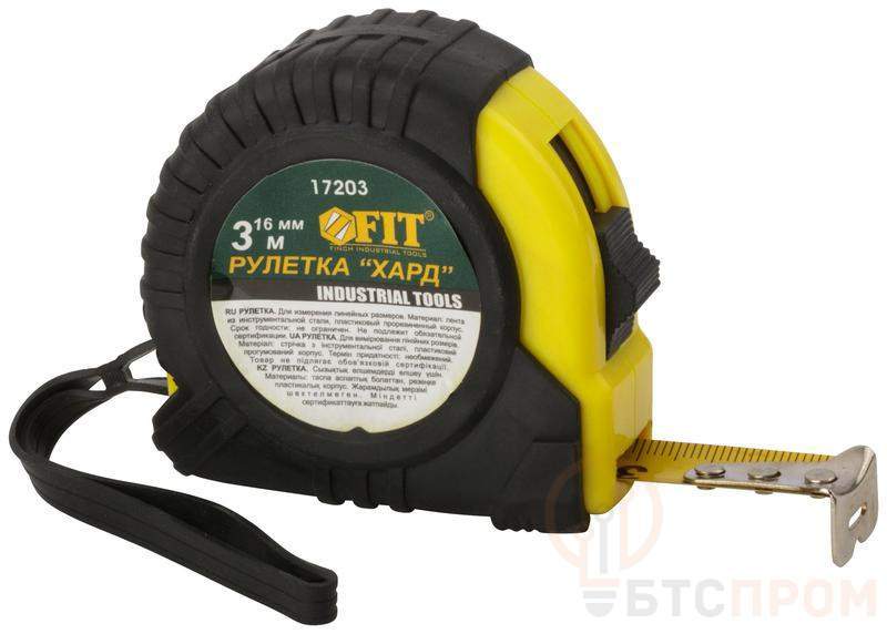 Рулетка ‘’Хард’’ FIT IT предназначена для измерений линейных размеров. Корпус рулетки изготовлен из ударопрочного ABS-пластика, устойчивого к механическим воздействиям. Резиновые накладки на корпусе предотвращают повреждения инструмента при падении или ударе. Полимерное покрытие измерительной ленты защищает шкалу от истирания. Рулетку можно крепить на ремне с помощью металлической клипсы. Тканевый ремешок позволяет носить рулетку на руке или хранить в подвешенном положении.