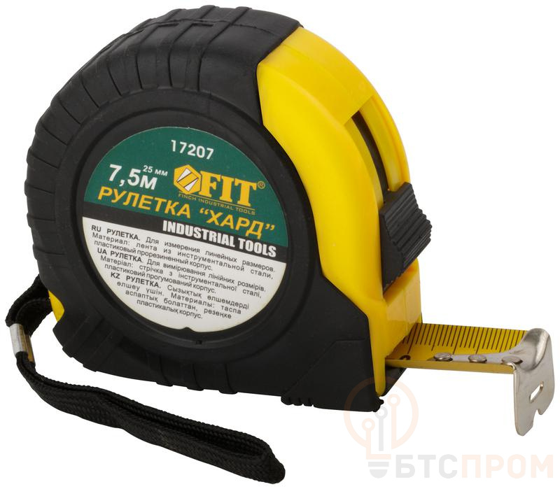Рулетка ‘’Хард’’ FIT IT предназначена для измерений линейных размеров. Корпус рулетки изготовлен из ударопрочного ABS-пластика, устойчивого к механическим воздействиям. Резиновые накладки на корпусе предотвращают повреждения инструмента при падении или ударе. Полимерное покрытие измерительной ленты защищает шкалу от истирания. Рулетку можно крепить на ремне с помощью металлической клипсы. Тканевый ремешок позволяет носить рулетку на руке или хранить в подвешенном положении.