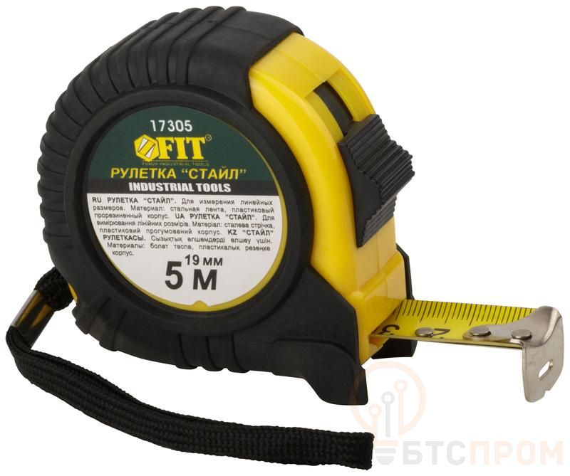 Рулетка для профессионального применения ‘’Стайл’’ FIT IT предназначена для измерений линейных размеров. Утолщенное полотно обладает высокой прочностью. Корпус рулетки изготовлен из ударопрочного ABS-пластика, устойчивого к механическим воздействиям. Резиновые накладки на корпусе предотвращают повреждения инструмента при падении или ударе. Полимерное покрытие измерительной ленты защищает шкалу от истирания. Рулетку можно крепить на ремне с помощью металлической клипсы. Тканевый ремешок позволяет носить рулетку на руке или хранить в подвешенном положении.