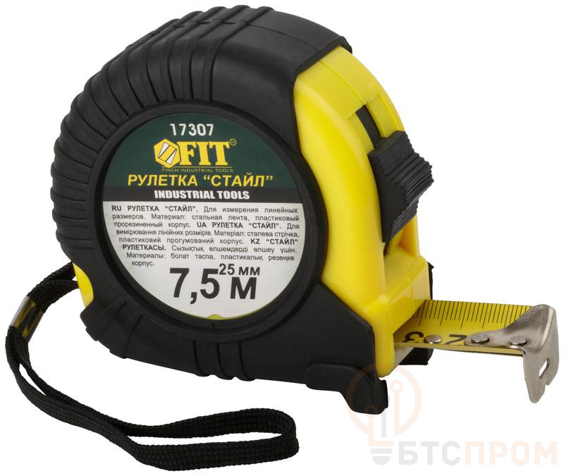Рулетка для профессионального применения ‘’Стайл’’ FIT IT предназначена для измерений линейных размеров. Утолщенное полотно обладает высокой прочностью. Корпус рулетки изготовлен из ударопрочного ABS-пластика, устойчивого к механическим воздействиям. Резиновые накладки на корпусе предотвращают повреждения инструмента при падении или ударе. Полимерное покрытие измерительной ленты защищает шкалу от истирания. Рулетку можно крепить на ремне с помощью металлической клипсы. Тканевый ремешок позволяет носить рулетку на руке или хранить в подвешенном положении.