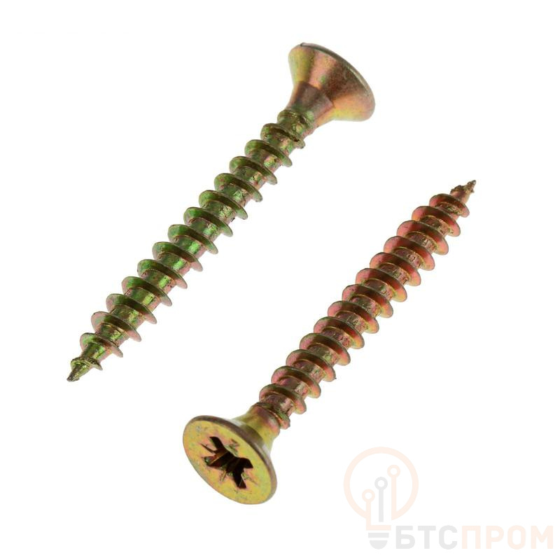 Область применения: крепление между собой различных деревянных конструкций, любых видов древесных плит (фанера, ДСП, ДВП); крепление различного листового материала, металлических пластин и направляющих, пластиковых элементов небольшой толщины к деревянным основаниям; монтаж легконагруженных конструкций к основанию из бетона, кирпича и газобетона, а также гипсокартона с использованием пластиковых дюбелей. Материал применения: дерево, металл, пластик, гипсокартон. Материал: углеродистая сталь с желтопассивированным защитным покрытием. Особенности: имеет потайную головку с крестообразным шлицем PZ (размер насадки зависит от диаметра самореза - PZ1 для саморезов 2-3 мм, PZ2 - для 3,5-5 мм, PZ3 - для 6 мм), крупную накатанную резьбу и острый наконечник. Благодаря своей резьбе (не такая острая, как у черных саморезов по дереву) их можно применять вместе с пластиковыми дюбелями для крепления различных легковесных конструкций и деталей к более плотным основаниям. Для скрытия головки самореза в толщине закрепляемой деревянной детали рекомендуется сделать раззенкованное отверстие специальным приспособлением - сверлом-зенкером.