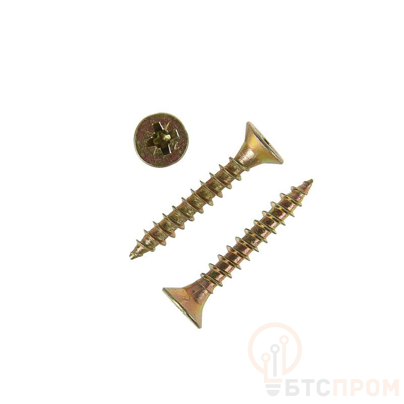 Область применения: крепление между собой различных деревянных конструкций, любых видов древесных плит (фанера, ДСП, ДВП); крепление различного листового материала, металлических пластин и направляющих, пластиковых элементов небольшой толщины к деревянным основаниям; монтаж легконагруженных конструкций к основанию из бетона, кирпича и газобетона, а также гипсокартона с использованием пластиковых дюбелей. Материал применения: дерево, металл, пластик, гипсокартон. Материал: углеродистая сталь с желтопассивированным защитным покрытием. Особенности: имеет потайную головку с крестообразным шлицем PZ (размер насадки зависит от диаметра самореза - PZ1 для саморезов 2-3 мм, PZ2 - для 3,5-5 мм, PZ3 - для 6 мм), крупную накатанную резьбу и острый наконечник. Благодаря своей резьбе (не такая острая, как у черных саморезов по дереву) их можно применять вместе с пластиковыми дюбелями для крепления различных легковесных конструкций и деталей к более плотным основаниям. Для скрытия головки самореза в толщине закрепляемой деревянной детали рекомендуется сделать раззенкованное отверстие специальным приспособлением - сверлом-зенкером.