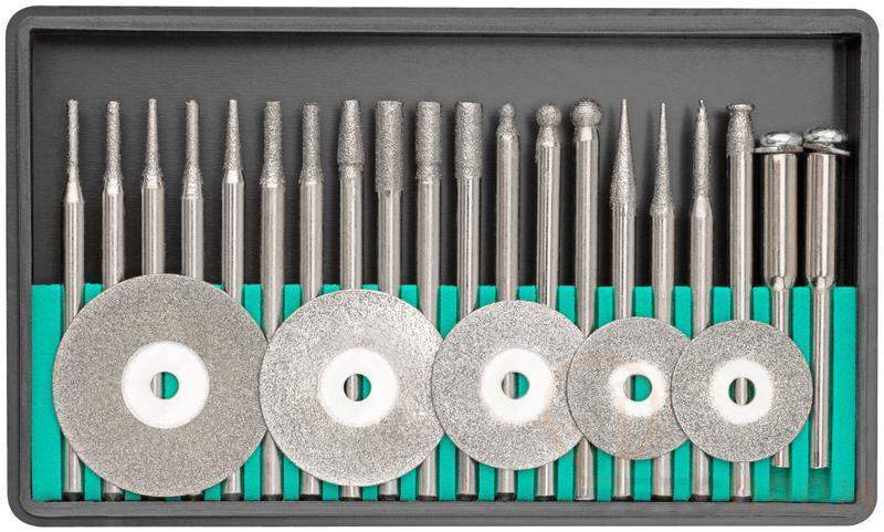 Набор шарошек и отрезных алмазных кругов FIT IT предназначен для обработки и резки мрамора, бетона, керамики, дерева, металла и других материалов. Используется для работы с гравировальной машинкой. Набор включает в себя круги алмазные отрезные (16 мм, 18 мм, 20 мм, 22 мм, 25 мм), шарошки алмазные (18 шт.), штифты (2 шт.). Все изделия изготовлены из инструментальной стали, что обеспечивает их долговечность и надежность в использовании. Режущие кромки содержат порошок из технических алмазов.