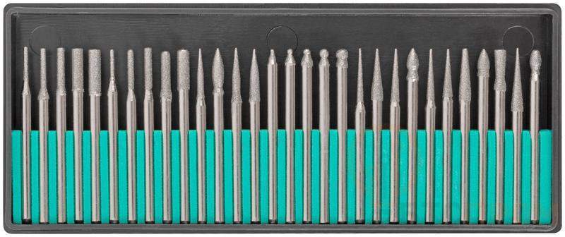 Шарошки алмазные FIT IT предназначены для обработки металлов, стекла, камня, дерева, пластика и других материалов. Для работы с гравировальной машинкой. Шарошки используются для работы с дрелью и гравировальной машинкой. Шарошки изготовлены из инструментальной стали, что обеспечивает их долговечность и надежность в использовании. Режущая кромка содержит порошок из технических алмазов. 30 разных типоразмеров в комплекте обеспечивают широкий спектр применения.