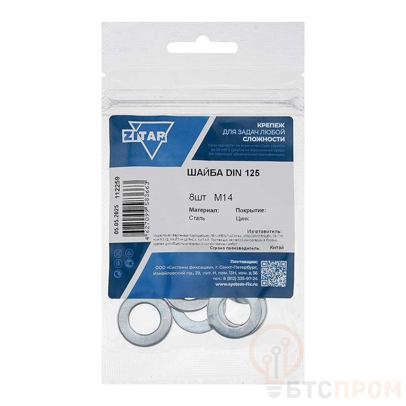 Шайба плоская М14 DIN 125а оцинк. (уп.8шт) Tech-Krep/Zitar 112259 фото в каталоге от BTSprom.by