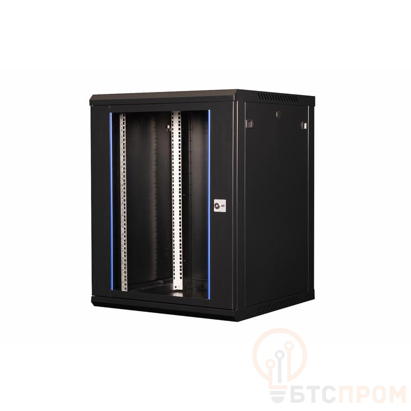 Шкаф оснащен дверью из закаленного черного стекла, которая обеспечивает визуальный контроль над устройствами, сохраняя современный и стильный внешний вид. Перфорированные боковые панели и верхняя крышка способствуют эффективной пассивной вентиляции, предотвращая перегрев компонентов.