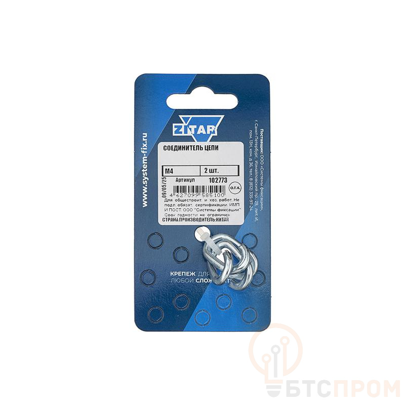 Область применения: предназначен для неразъемного соединения цепей при ремонте или наращивании длины, а также для крепления к конструкциям или опорам. Не рекомендуется применять для грузоподъемных работ. Материал: углеродистая сталь с антикоррозионным цинковым покрытием. Особенности: после присоединения соединитель необходимо заварить при помощи электросварки. Размер соединителя цепи соответствует диаметру поперечного сечения проволоки, из которой он выполнен.