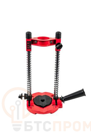 Ключевые характеристики: высота стойки — 290 мм, максимальная глубина сверления — 40 мм, диаметр патрона дрели — до 60 мм. Важная особенность — механизм регулировки угла наклона дрели, позволяющий выполнять отверстия под заданным углом.