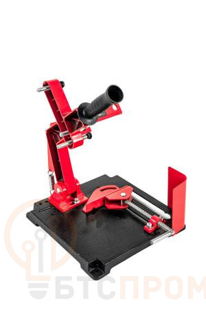 Модель предназначена для работы с УШМ (болгарками), использующими отрезные диски диаметром от 180 до 230 мм. Ключевая особенность — наличие угловых тисков с фиксированным углом реза в 45 градусов, что позволяет выполнять точные и аккуратные запилы под заданным углом без дополнительных настроек.