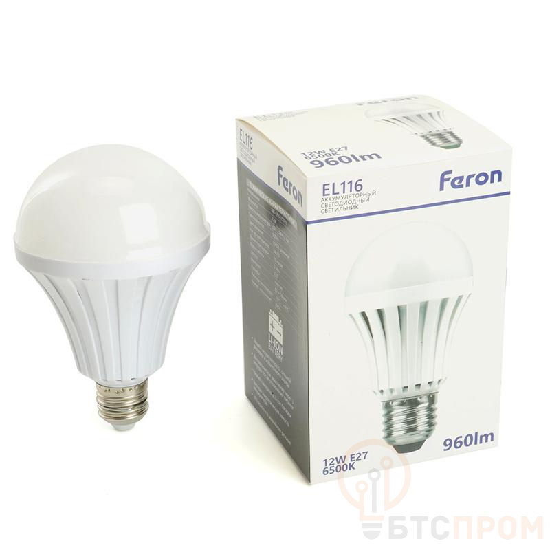 Светильник аккумуляторный FERON EL116 с цоколем, 34LED/дневной, 185-265V, IP20, аккумулятор 3,7/1200mAh/Li-Ion (литий-ионный), количество режимов 1, время зарядки 12 часов, время работы 3 часа, цвет белый, 80*80*160мм