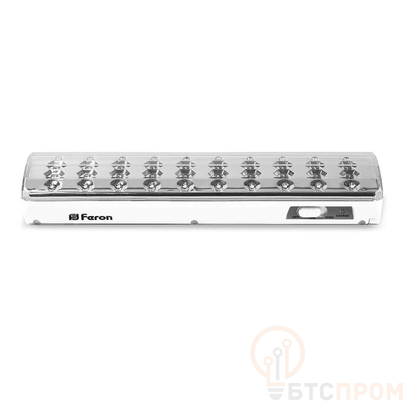 Светильник аккумуляторный FERON EL21 DC, 40LED/дневной, 110-240V, IP20, аккумулятор 3,7/1300mAh/Li-Ion (литий-ионный), количество режимов 2, время зарядки 20 часов , время работы 3/6 часов, цвет белый, 258*67*42мм