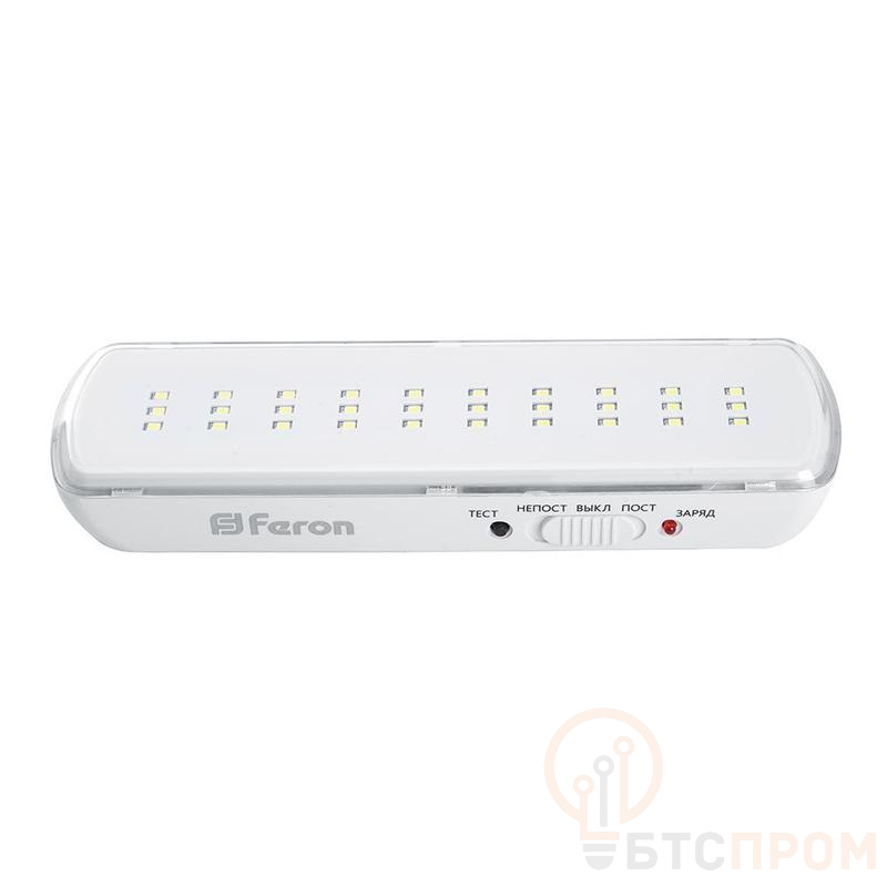 Светильник FERON EM110 AC/DC с наклейкой, 30LED/дневной, 110-240V, IP20, аккумулятор 3,6/400 mAh/Ni-Cd (никель-кадмиевый), количество режимов 2, время зарядки 5 часов, время работы 1 час, цвет белый, 205*31*58мм