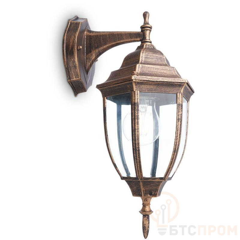 Светильник садово-парковый, серии «Марсель», (НБУ) FERON PL6002 60W, E27, 230V, IP44, цвет черное золото, 6-и гранник, на стену вниз, 190*165*380мм