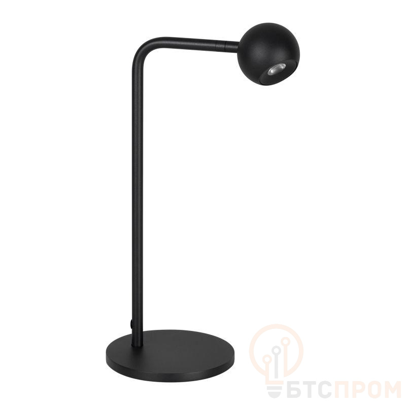 Декоративный настольный светильник. Мощность 6 Вт, св. поток 540 лм, 90 лм/Вт, теплый 3000К, CRI>90, угол 30°, напряжение питания 230 В. Черный корпус из алюминия (основание, ножка, светоизлучаль в форме шара), степень защиты IP20. Размер основания O140?11 мм, размер ножки O12,5?430х120 мм, размер светоизлучателя O65?55,5 мм. Длина провода 1580 мм, питание от сети 220-240V., пульсация <1%