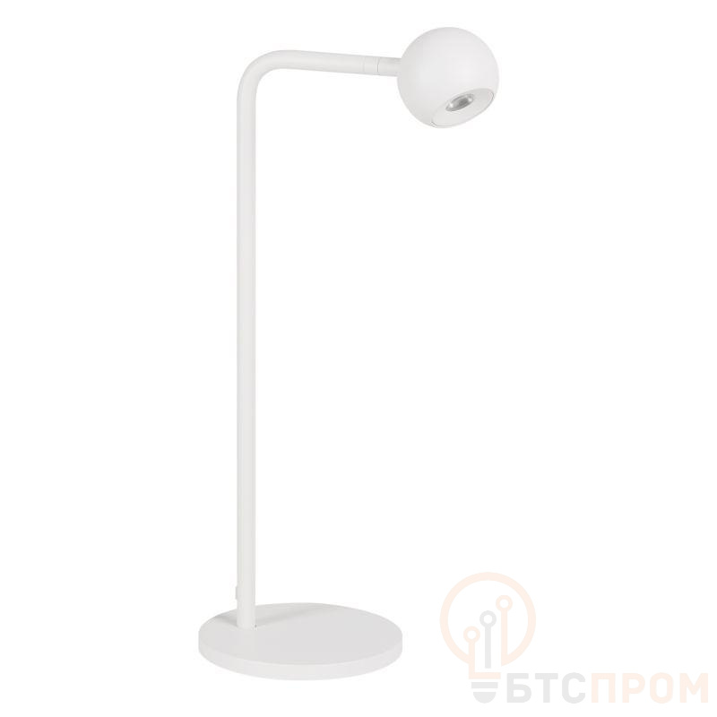 Декоративный настольный светильник. Мощность 6 Вт, св. поток 540 лм, 90 лм/Вт, теплый 3000К, CRI>90, угол 30°, напряжение питания 230 В. Белый корпус из алюминия (основание, ножка, светоизлучаль в форме шара), степень защиты IP20. Размер основания O140?11 мм, размер ножки O12,5?430х120 мм, размер светоизлучателя O65?55,5 мм. Длина провода 1580 мм, питание от сети 220-240V., пульсация <1%
